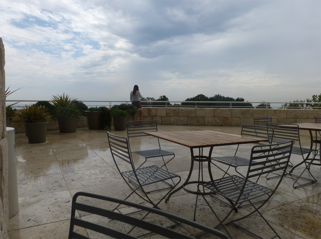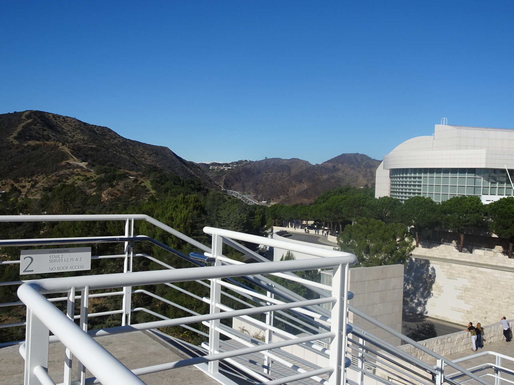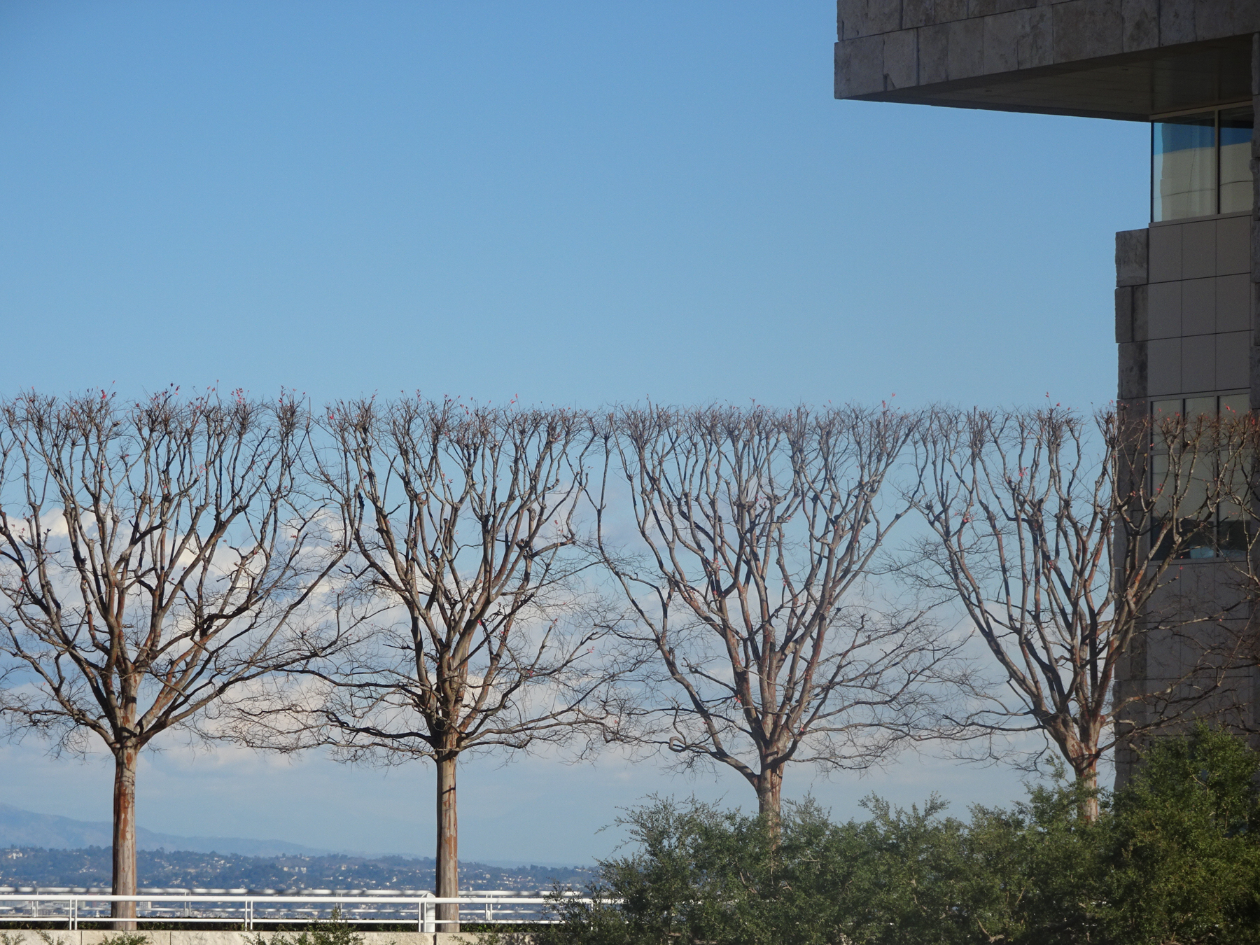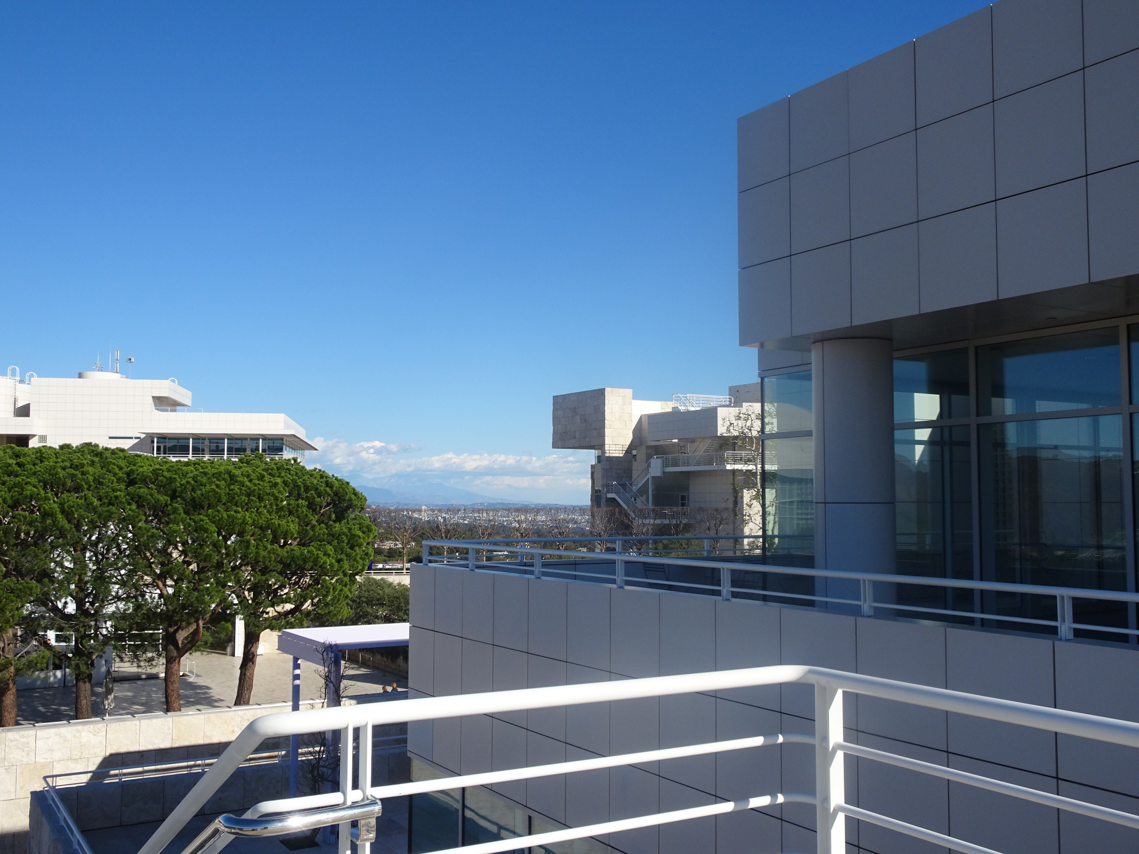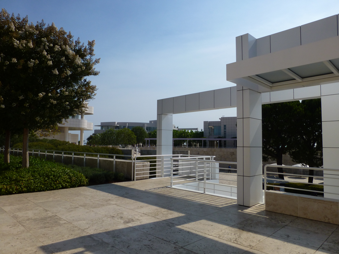 I can’t be in Los Angeles without stopping here, at the Getty Center. I alight from the tram that floats us on air up the steep and winding path, I start walking, and then it happens: my body is, I am, aware of being inside this network — of structures, angles, curves, widening vectors, trellises and pergolas with vistas, quiet empty spaces, stairs climbing the outside walls, tables and chairs awaiting on the mountain floor.