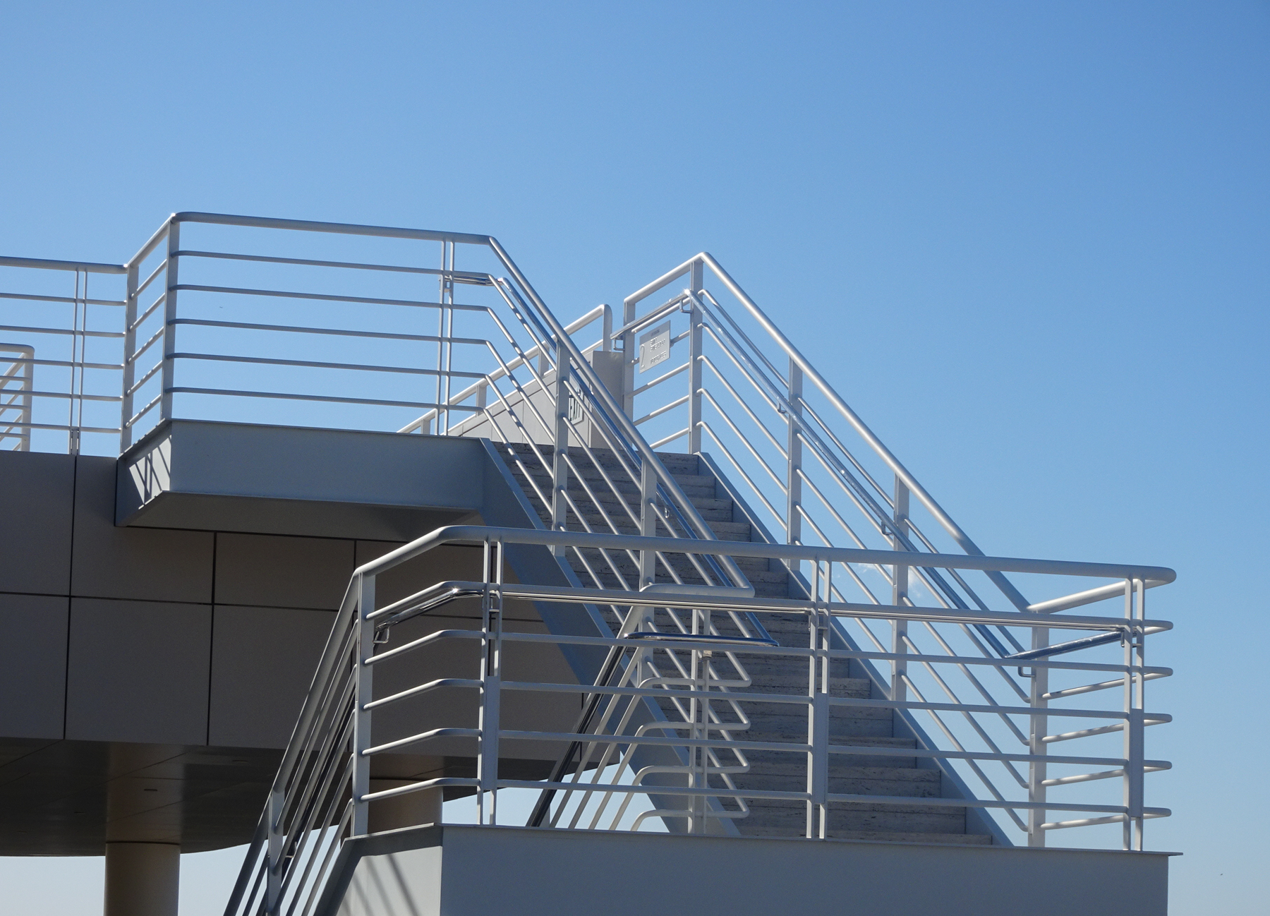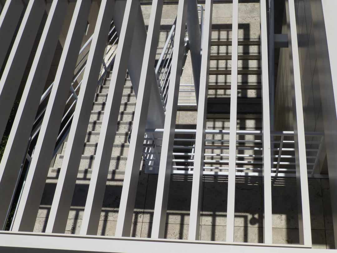 Stairs climbing a museum wall at the Getty Center. Elevated terrace, Museum Courtyard. Photograph © Frances D. Stevens.