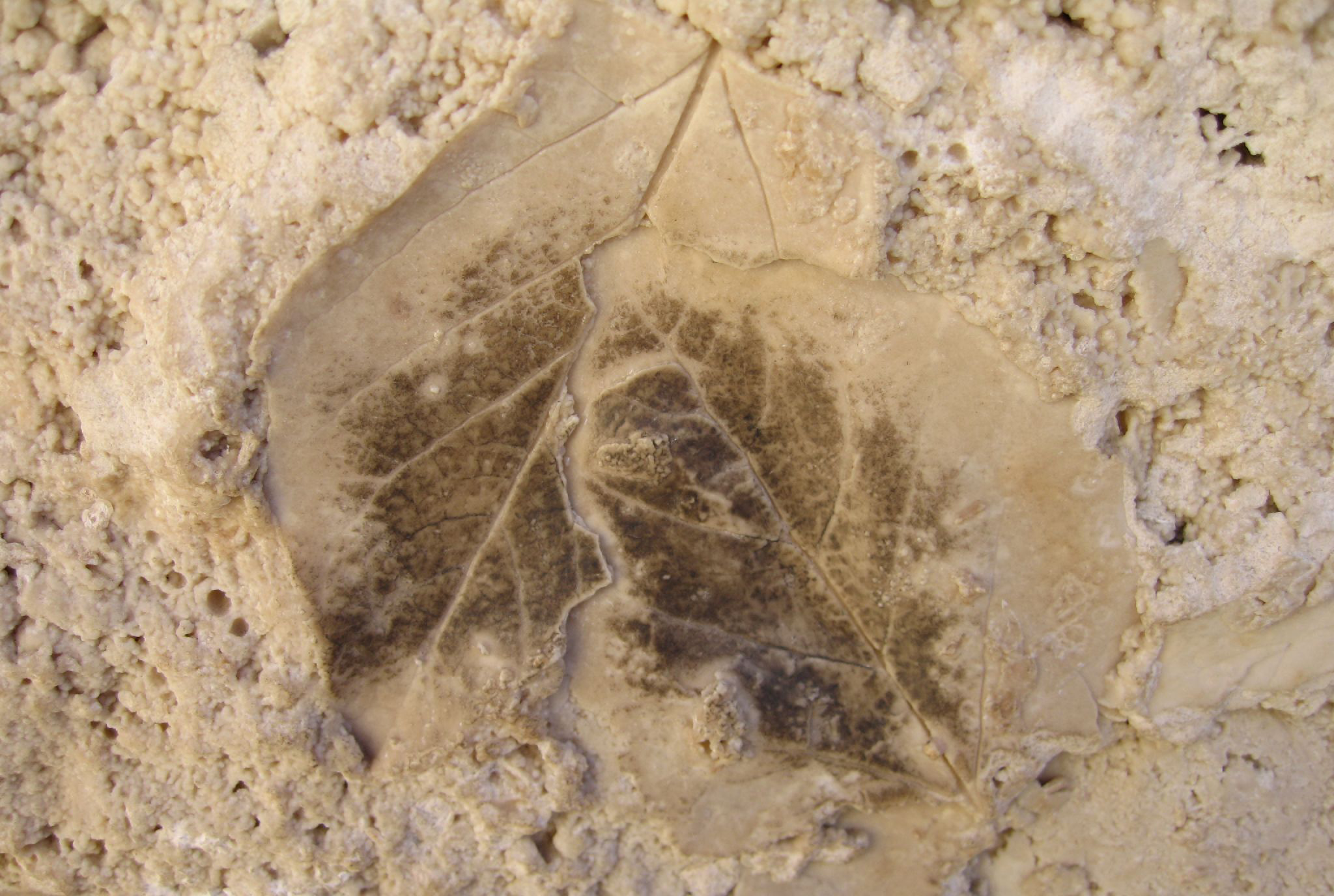 Part of a travertine wall at the Getty Center, with fossil imprints. Photograph © Kevin Stanchfield, via Wikimedia Creative Commons.